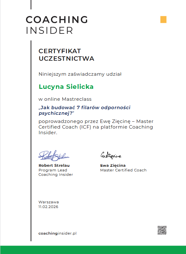 Pracując nad swoją zmianą zawodową w moim towarzystwie gwarantujesz sobie 100% pewności, że nikt nie będzie Cię oceniał, empatyczny i zindywidualizowany dobór proponowanych metod i rozwiązań, ale też zdecydowane dopingowanie do ustalania kolejnego kroku, bo wiem, że zmianę buduje się aktywnie.